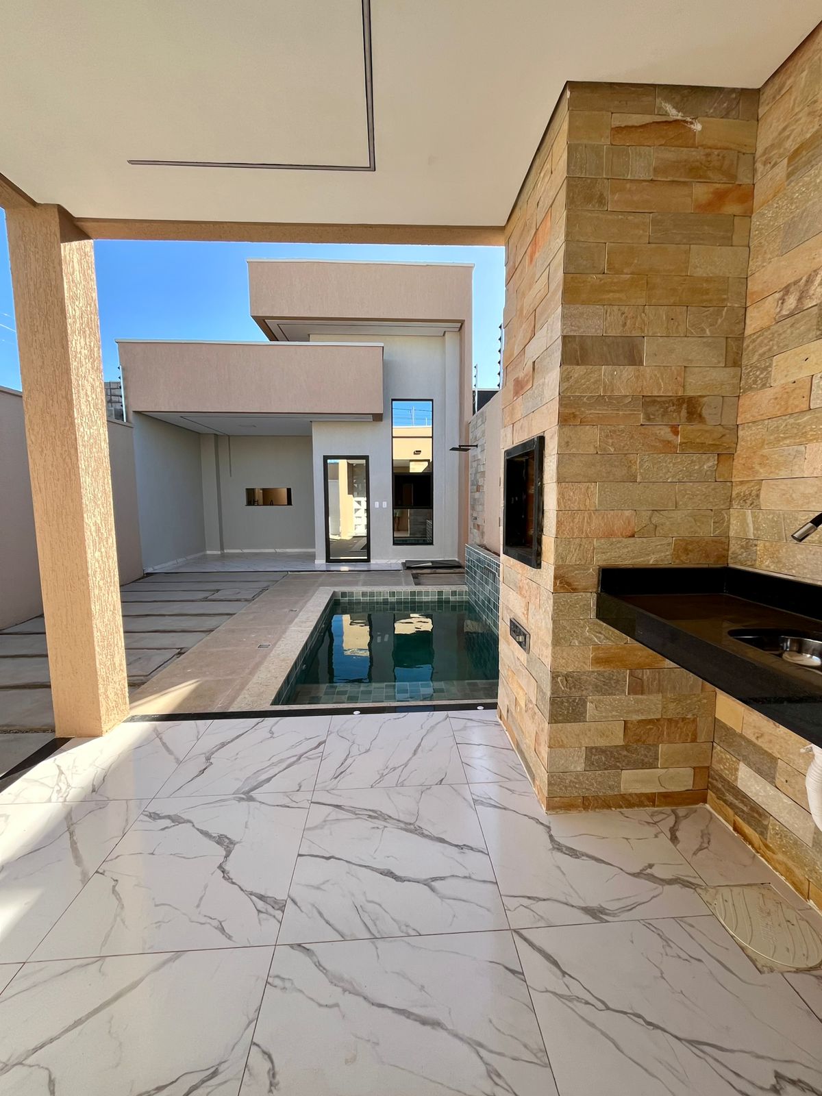A área externa dispõe de piscina em alvenaria com hidromassagem (bomba, filtro e iluminação em LED), deck com churrasqueira em revestimento rústico e garagem para 2 veículos.