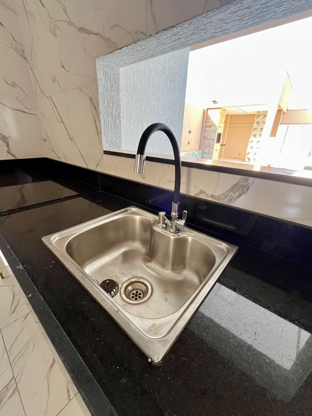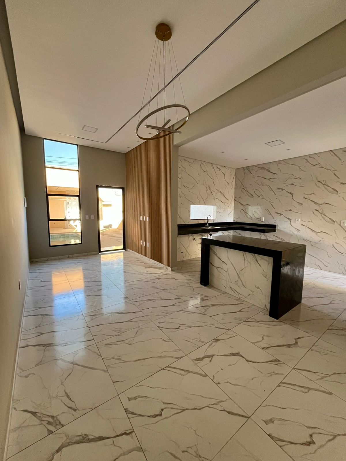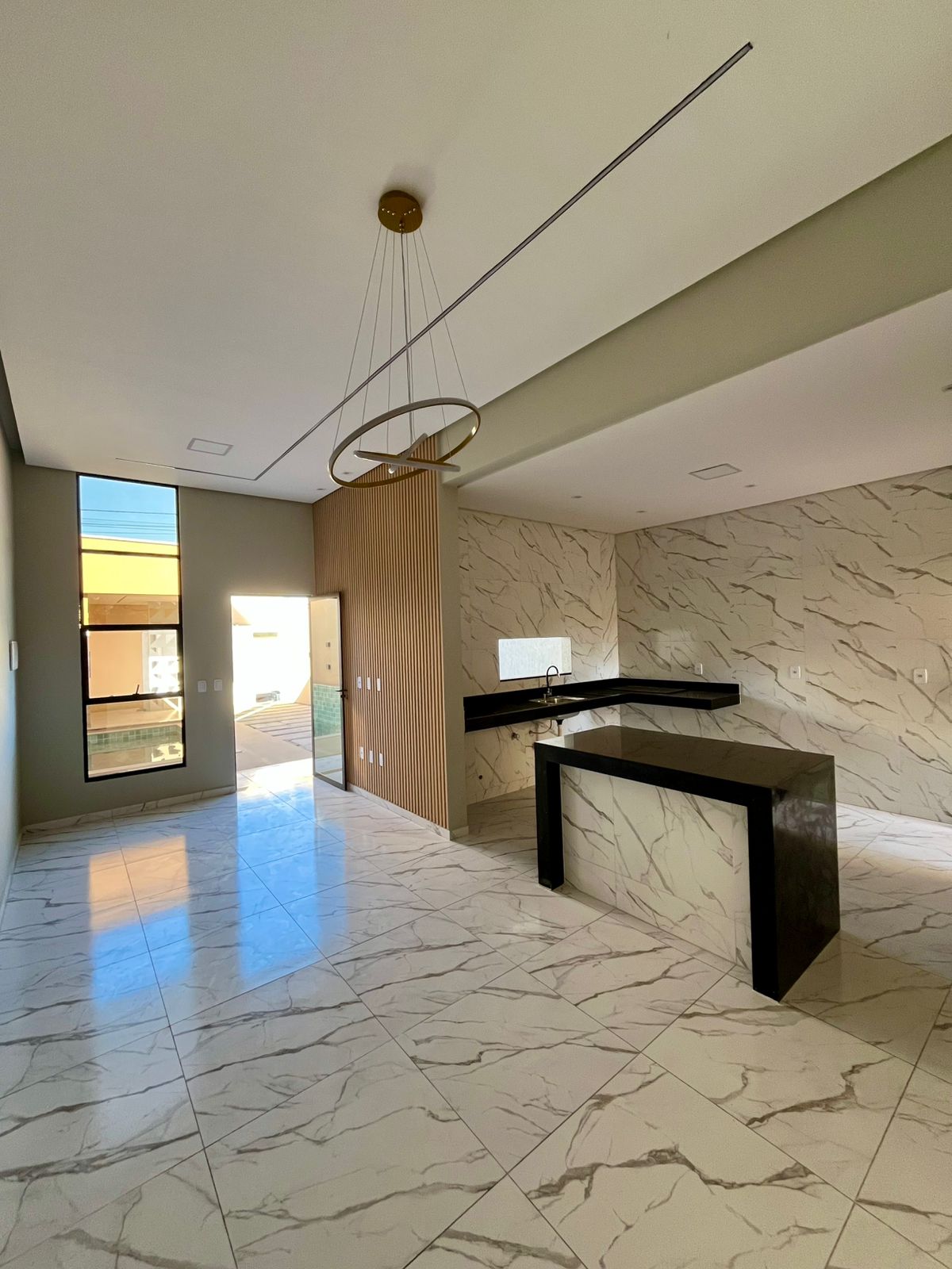 Possui pé-direito alto de 3,70m, cozinha com balcão e ilha em mármore Preto São Gabriel, despensa com prateleiras, iluminação em LED com lustre, além de janelas em vidro 8mm com armação em alumínio preto e fachada moderna com vidro refletivo.