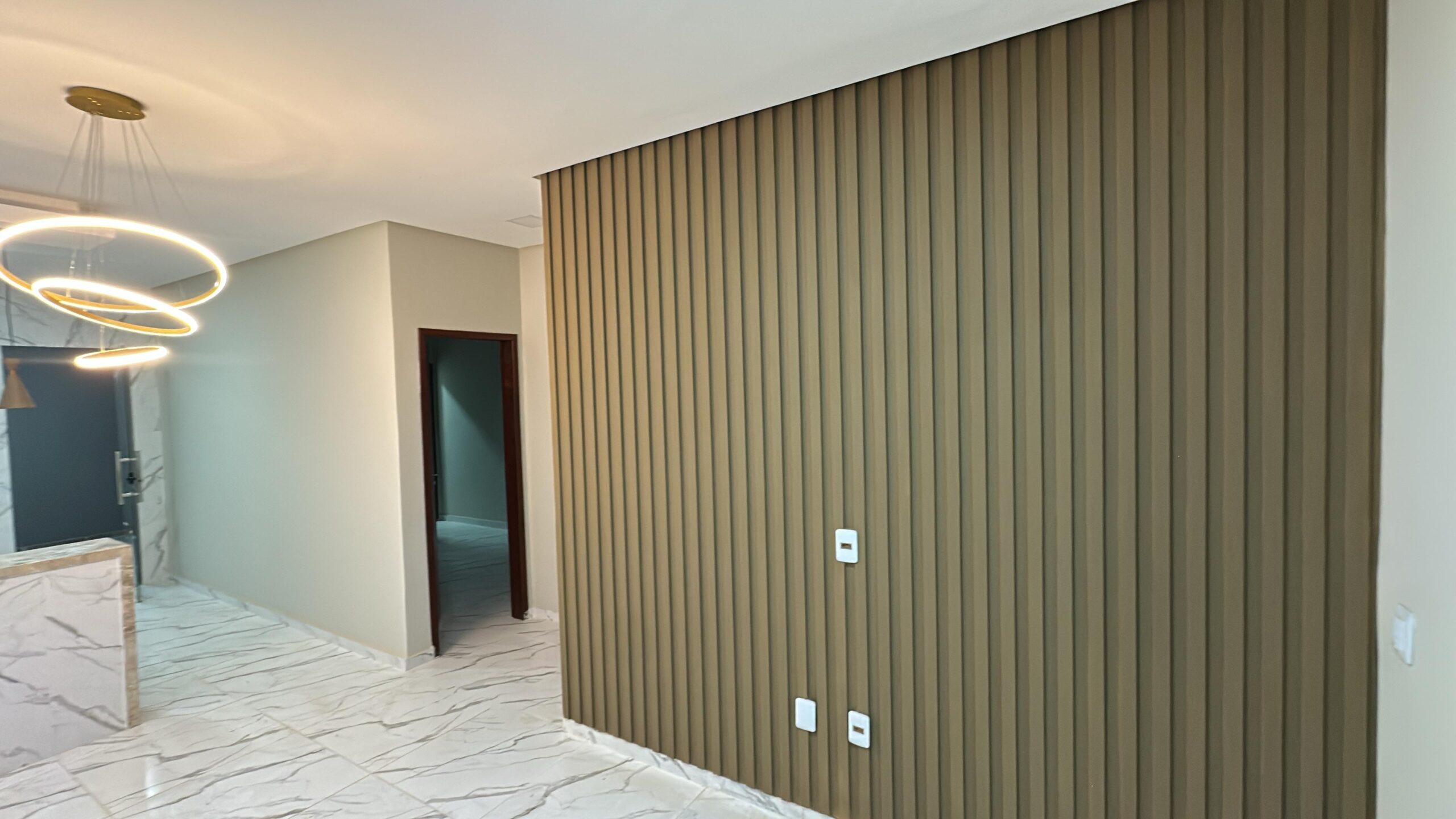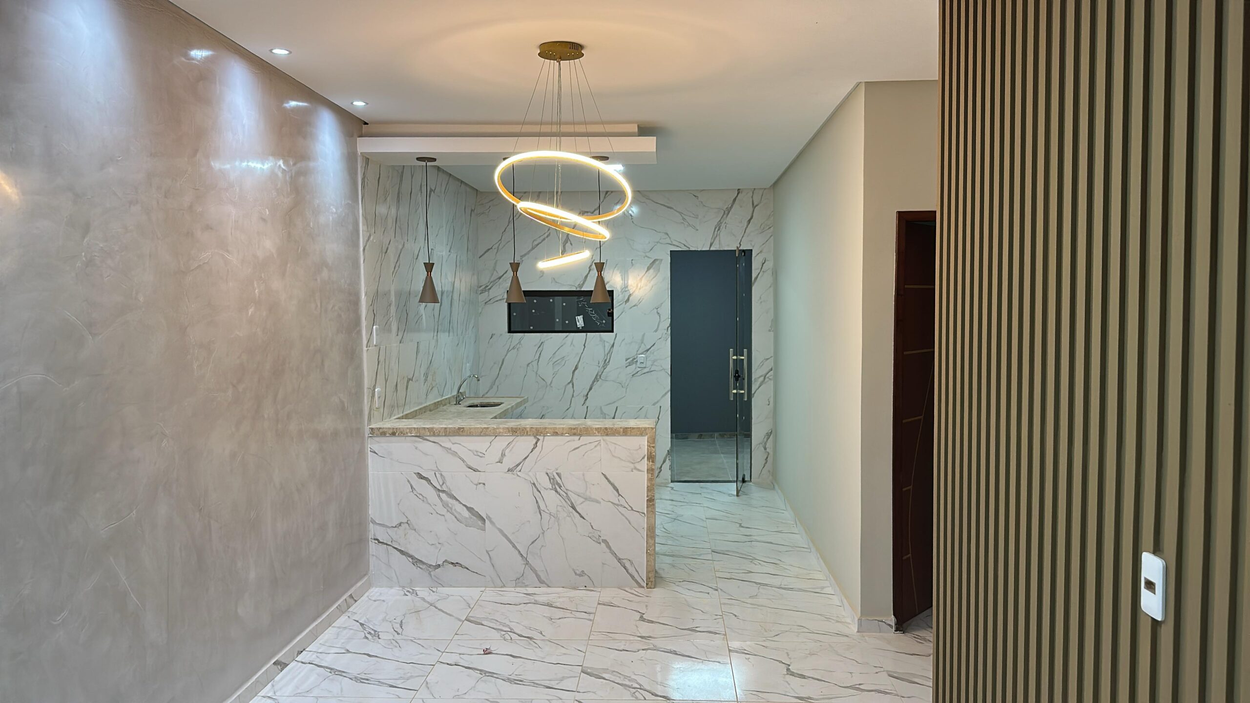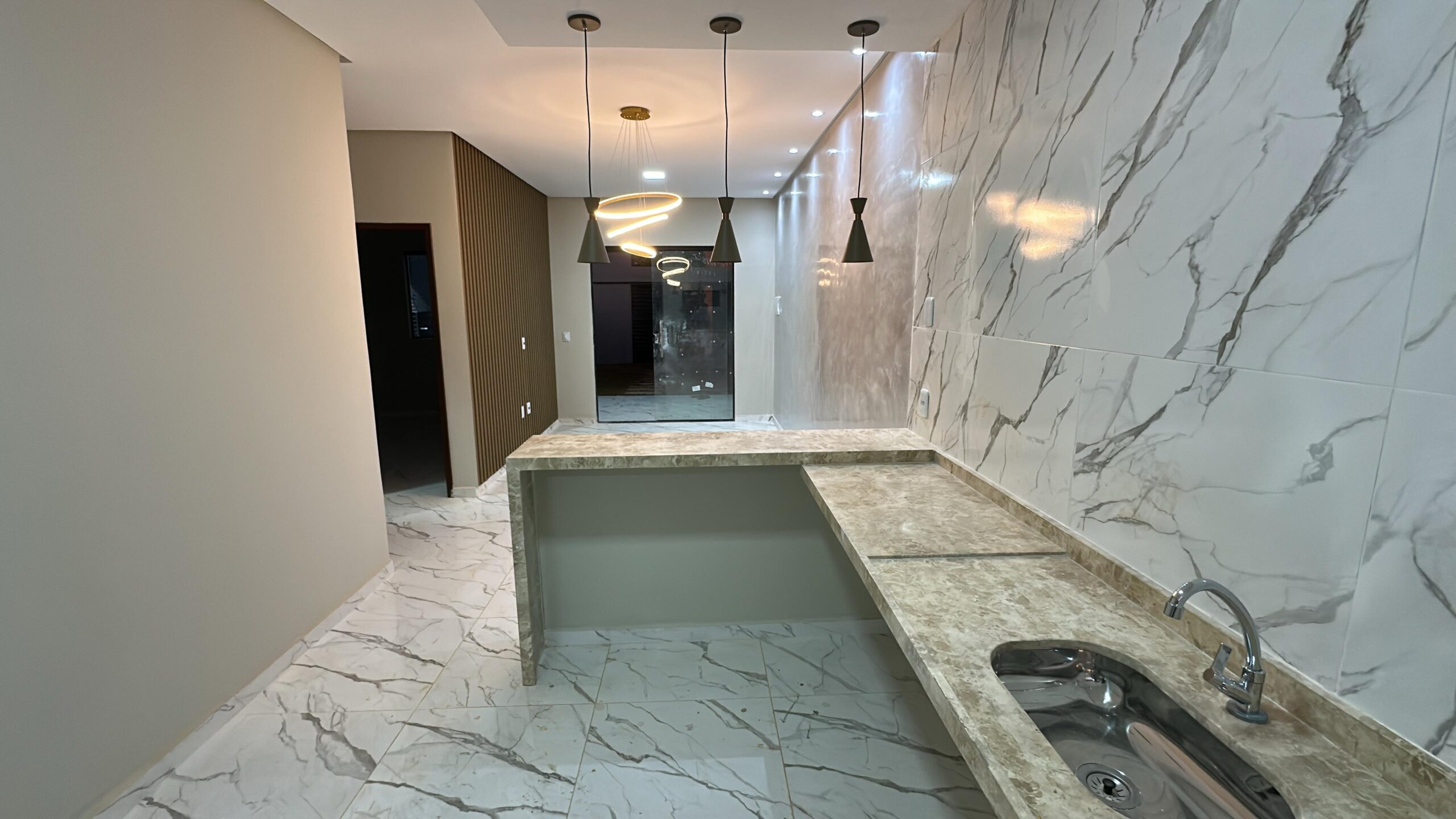 A cozinha possui balcão em L em granito travertino, além de projeto de iluminação 100% em LED, ripado em gesso e efeito mármore. O imóvel dispõe ainda de área de serviço coberta, churrasqueira com pia, garagem para 2 vagas (1 coberta) e fachada moderna com bica revestida em pedra natural.