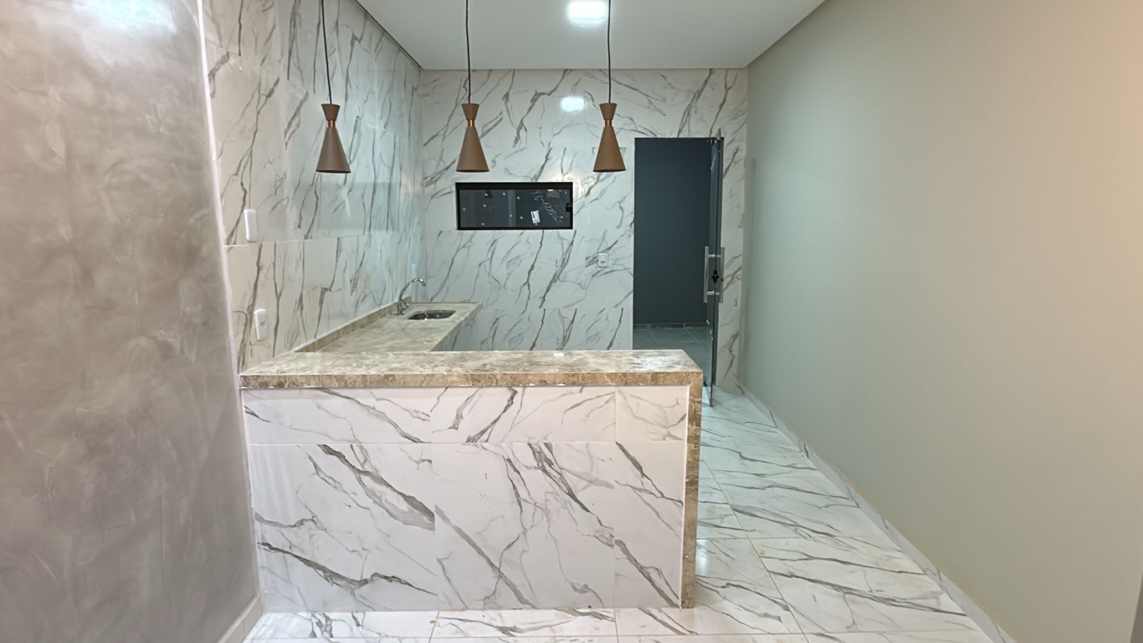 - Cozinha com balcão em L em granito travertino